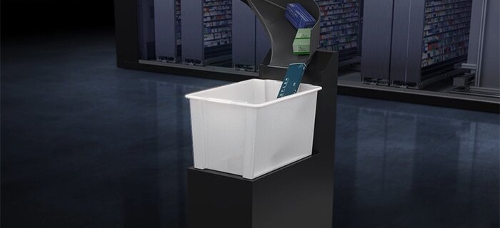 O módulo de armazenamento rápido frontal com mais de 100 compartimentos permite o armazenamento de medicamentos ininterrupto de até 350 pacotes/hora. Os produtos estão disponíveis para a saída imediatamente após o armazenamento.